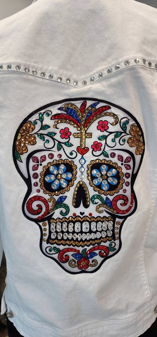 White skull denim upcycled jeans jacket size medium. Featuring extensive embellishments on front and back. Exquisite style by Tia couture.