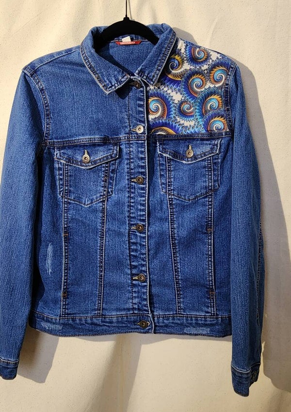Paisley peacock, boasting a range of vibrant colors. This medium uppcycled jacket evokes the sensation of being among the birds.