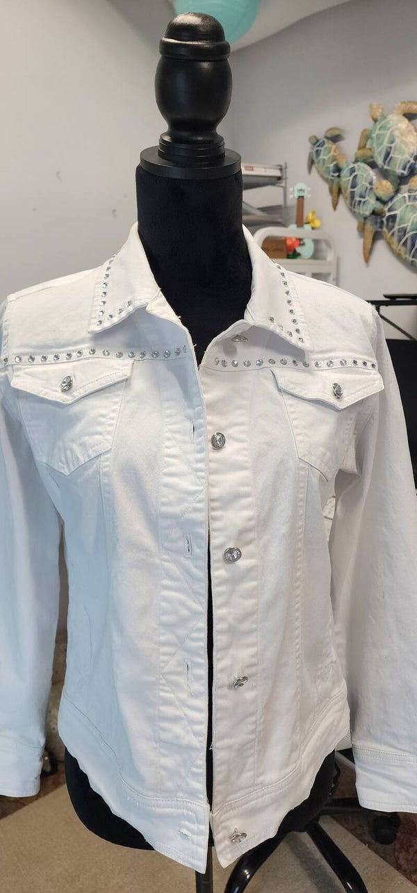 White skull denim upcycled jeans jacket size medium. Featuring extensive embellishments on front and back. Exquisite style by Tia couture.