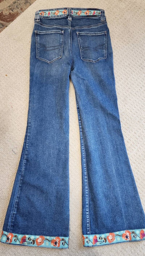 Handcrafted from secondhand jeans and fabric scraps, these are eco-conscious jeans that make a statement in every stitch.
