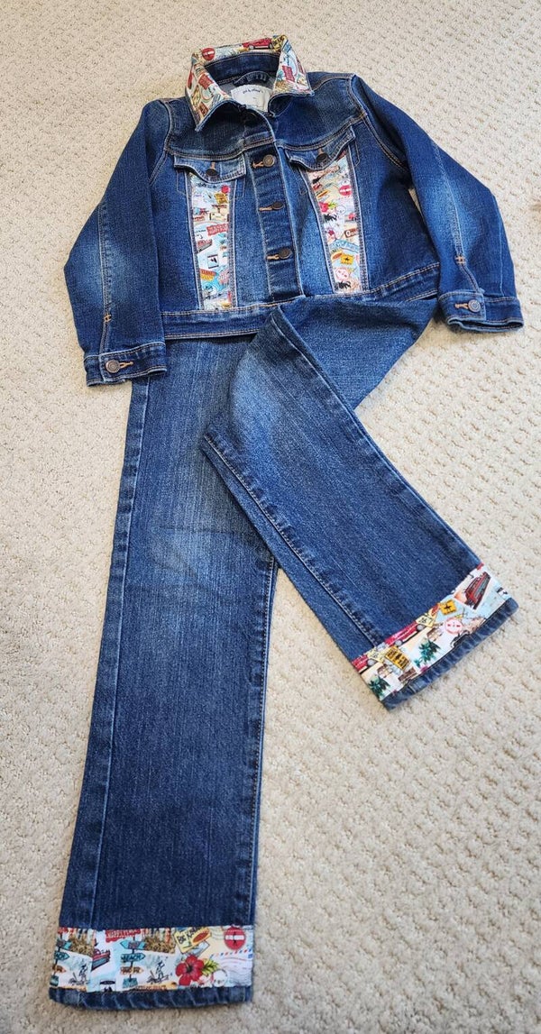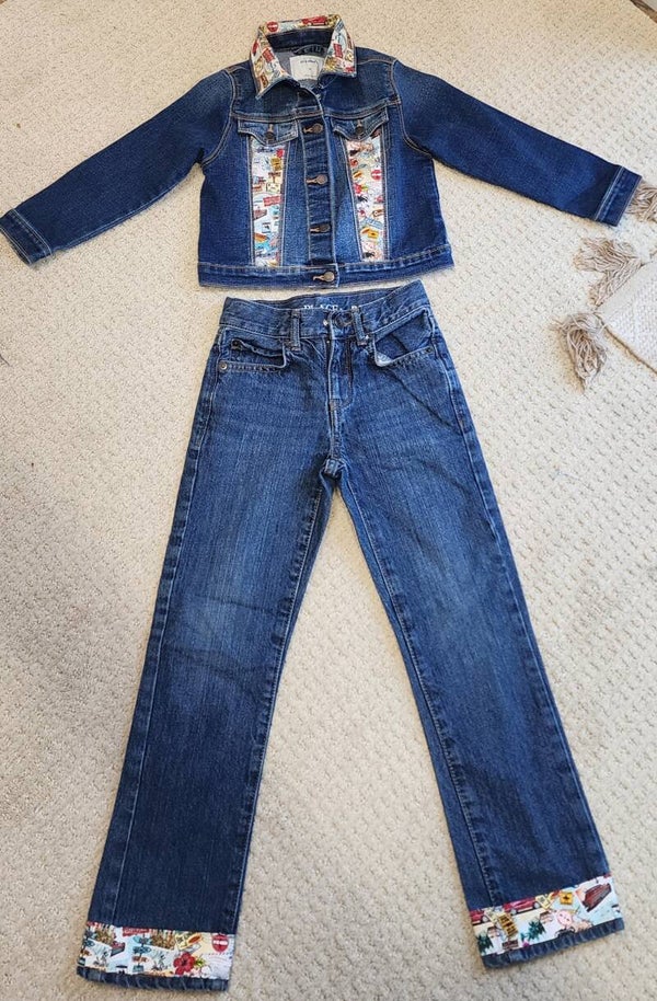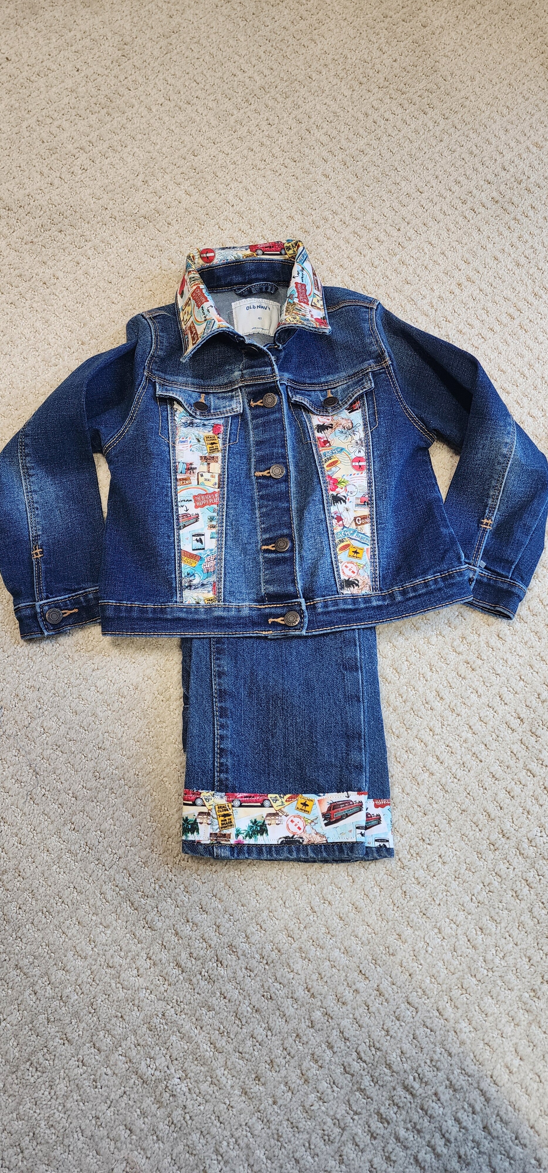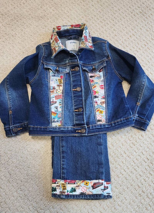 Coordinated set includes a denim jacket and jeans, both upcycled and refreshed